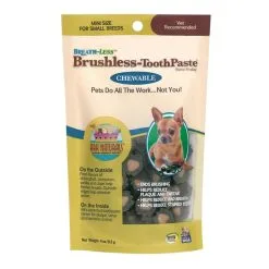 Now your pets can care for their own teeth! Ark Naturals BREATH-LESS Brushless Toothpaste is a multiple award-winning chewable dental solution for pets. BREATH-LESS Brushless Toothpaste is a highly digestible dental chew with clinically proven, natural herbal ingredients. On the outside: Fresh flavors of alfalfa (source of chlorophyll), cinnamon, vanilla and clove help freshen breath. Outside ridges help abrasive action. On the inside: Ark’s patented toothpaste center for plaque, tartar and bacteria control. Recipient of multiple awards as chosen by national pet magazines and their readers! Available in mini size, small/medium, medium/large and large. Use with BREATH-LESS Plaque Zapper for maximum benefits.