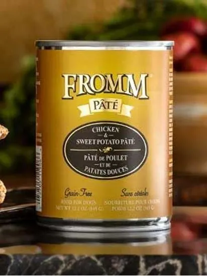 Chicken, chicken broth, chicken liver, sweet potatoes, lentils, carrots, potatoes, peas, tomato paste, salmon oil (preserved with mixed tocopherols), salt, potassium chloride, Minerals [dicalcium phosphate, zinc sulfate, zinc proteinate, calcium carbonate, ferrous sulfate, copper sulfate, calcium iodate, iron proteinate, copper proteinate, manganese sulfate, manganese proteinate, cobalt sulfate, cobalt proteinate], locust bean gum, xanthan gum, Vitamins [Vitamin E supplement, niacin supplement, d-calcium pantothenate, riboflavin supplement, vitamin A acetate, biotin, thiamine mononitrate, Vitamin B12 supplement, pyridoxine hydrochloride, Vitamin D3 supplement, folic acid].