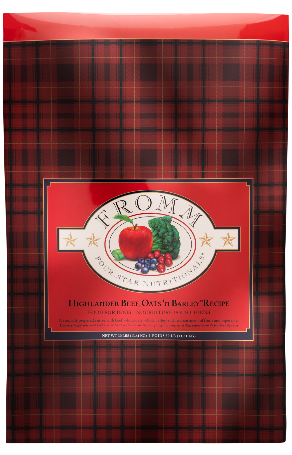 Fromm Four-Star Highlander Beef, Oats, ‘n Barley™ Recipe Food for Dogs is a delicious Scottish-inspired entrée of beef, whole oats, whole barley, and an assortment of fruits and vegetables. This distinctive blend is specially prepared to ensure consistency, quality, and superior taste in each and every bowl. Highlander Beef, Oats, ’n Barley™ Recipe provides complete and balanced nutrition for dogs of all ages and can be alternated with other Fromm Four-Star recipes.