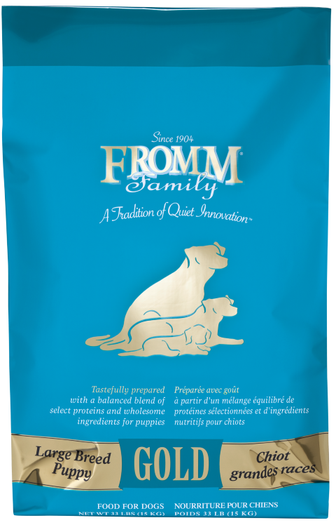 Fromm Family Large Breed Puppy Gold Food for Dogs is specifically developed for puppies of breeds with adult weights greater than 50 pounds. Large Breed Puppy Gold has lower protein and fat than traditional puppy food to provide the large breed puppy with an optimum level of energy and nutrition required for controlled and proper growth.