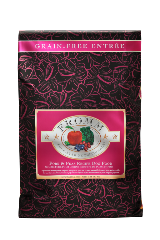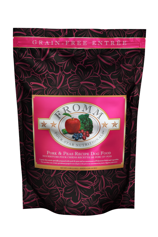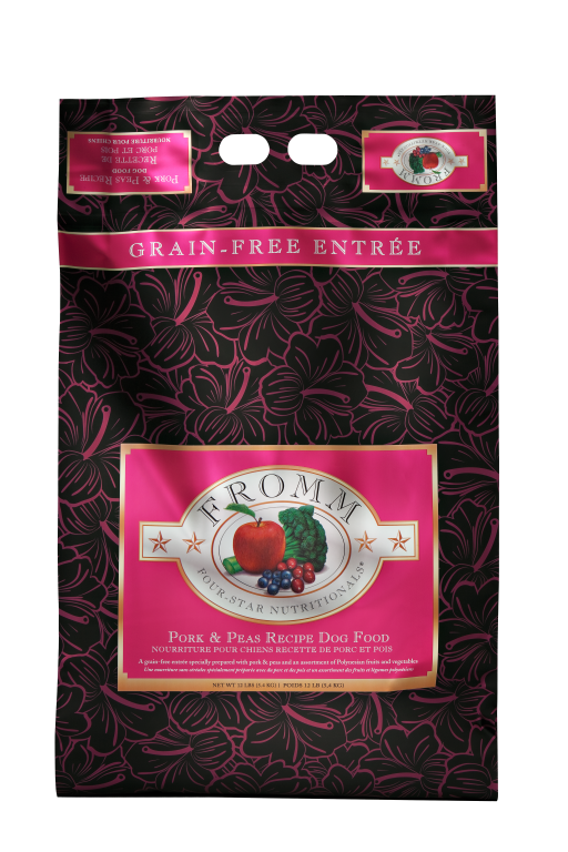 Fromm Four-Star Pork & Peas Recipe Dog Food is a grain-free Polynesian style entrée of pork and peas combined with an assortment of fresh, handpicked vegetables and fruits. This artisan recipe is prepared in small batches, ensuring consistency, quality, and superior taste in each and every bowl. Pork & Peas Recipe provides complete and balanced nutrition for dogs of all ages and, for variety, can be alternated with other Fromm Four-Star recipes.