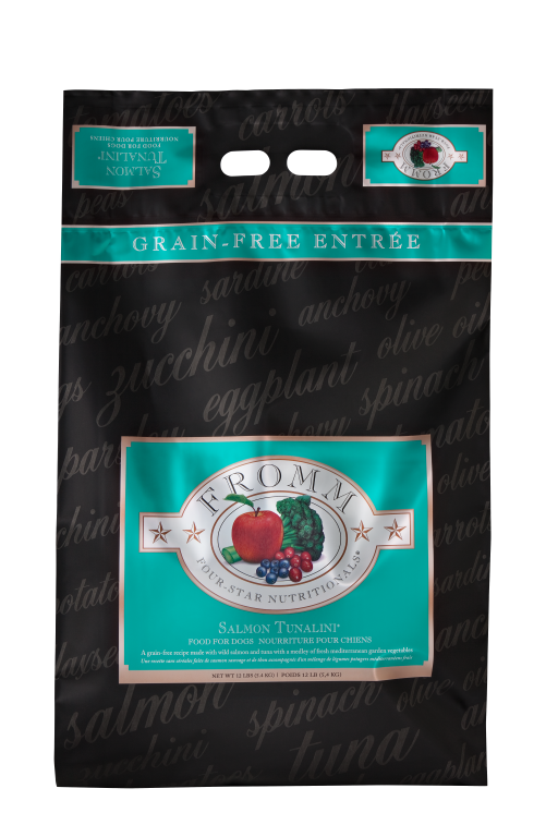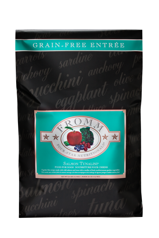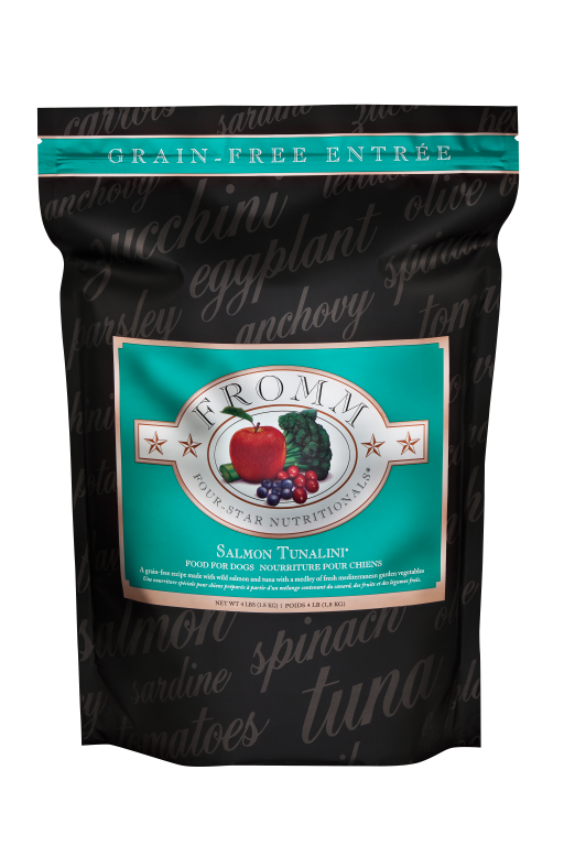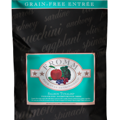 Fromm Four-Star Salmon Tunalini® Recipe Food for Dogs is an enticing grain-free entrée with salmon, tuna, and an assortment of fruits & vegetables. This distinctive blend is specially prepared to ensure consistency, quality, and superior taste in each and every bowl. Salmon Tunalini® Recipe provides complete and balanced nutrition for dogs of all ages and can be alternated with other Fromm Four-Star recipes.