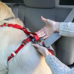 This crash-tested dog car harness keeps you and your pup safe while driving. It has been designed as a dog safety harness, not a converted walking harness. The all-steel Nesting Buckle System is based on the engineering for harnesses used by rock climbers and linesmen ensuring strength and safety. With five adjustments points, it’s easy to get a near custom fit for any dog, regardless of size and proportions. The chest pad reduces stress on the trachea and sternum while dispersing kinetic energy across the chest of the dog. This is important during those rare, but dangerous impact crashes. Because it’s designed with comfort in mind, our Enhanced Strength Tru-Fit HarnessTM can also be used as a no-pull walking harness. There’s a halt ring on the front chest plate. If your pup tries to pull, it will just turn him around effectively training him that pulling will get him nowhere! For maximum crash protection and to limit excursion, you should use the included carabiner to attach the harness to you car seat belt system. For instructions on how to properly use this harness and strap your dog into the car, follow these 3 Steps to Buckle Up Your Pup.