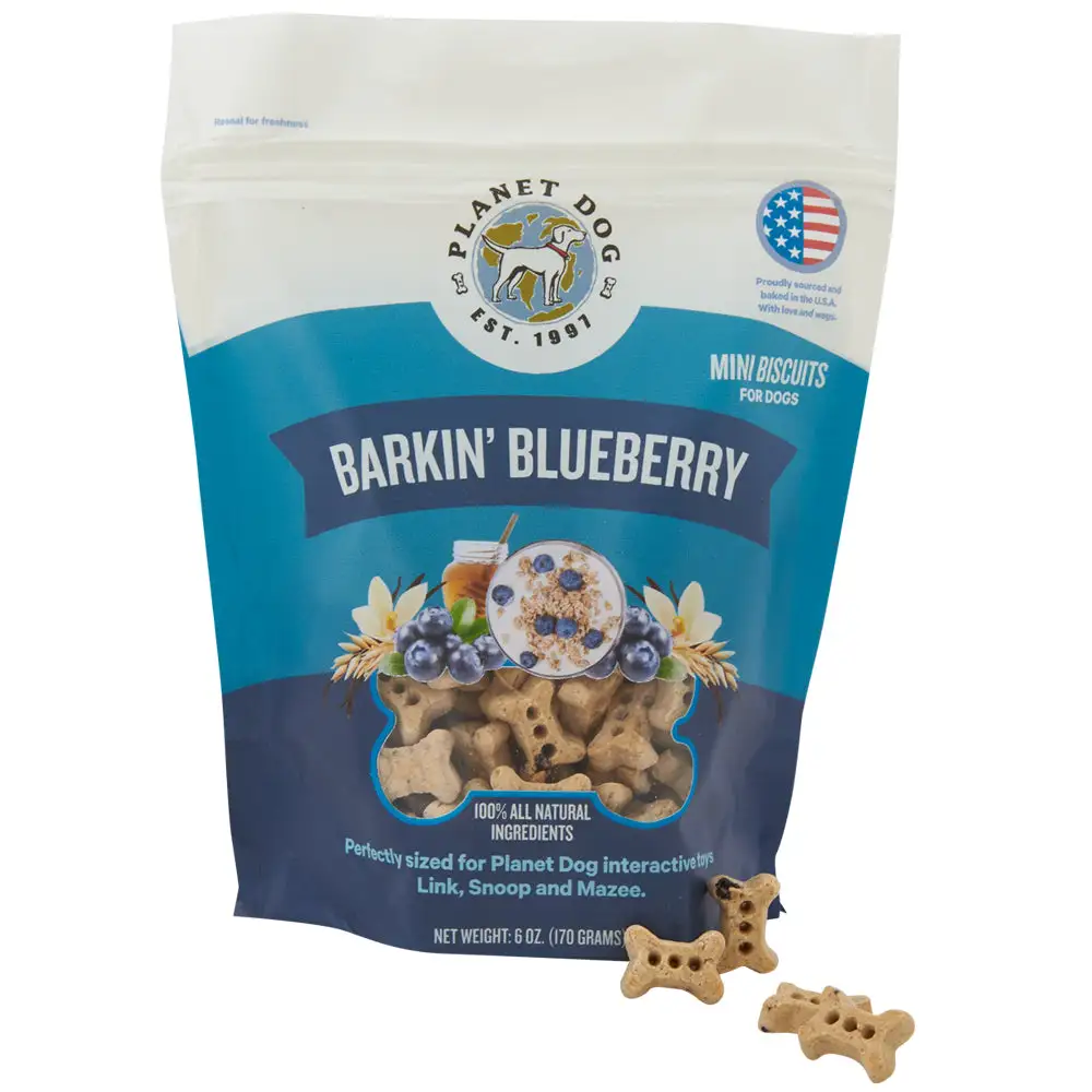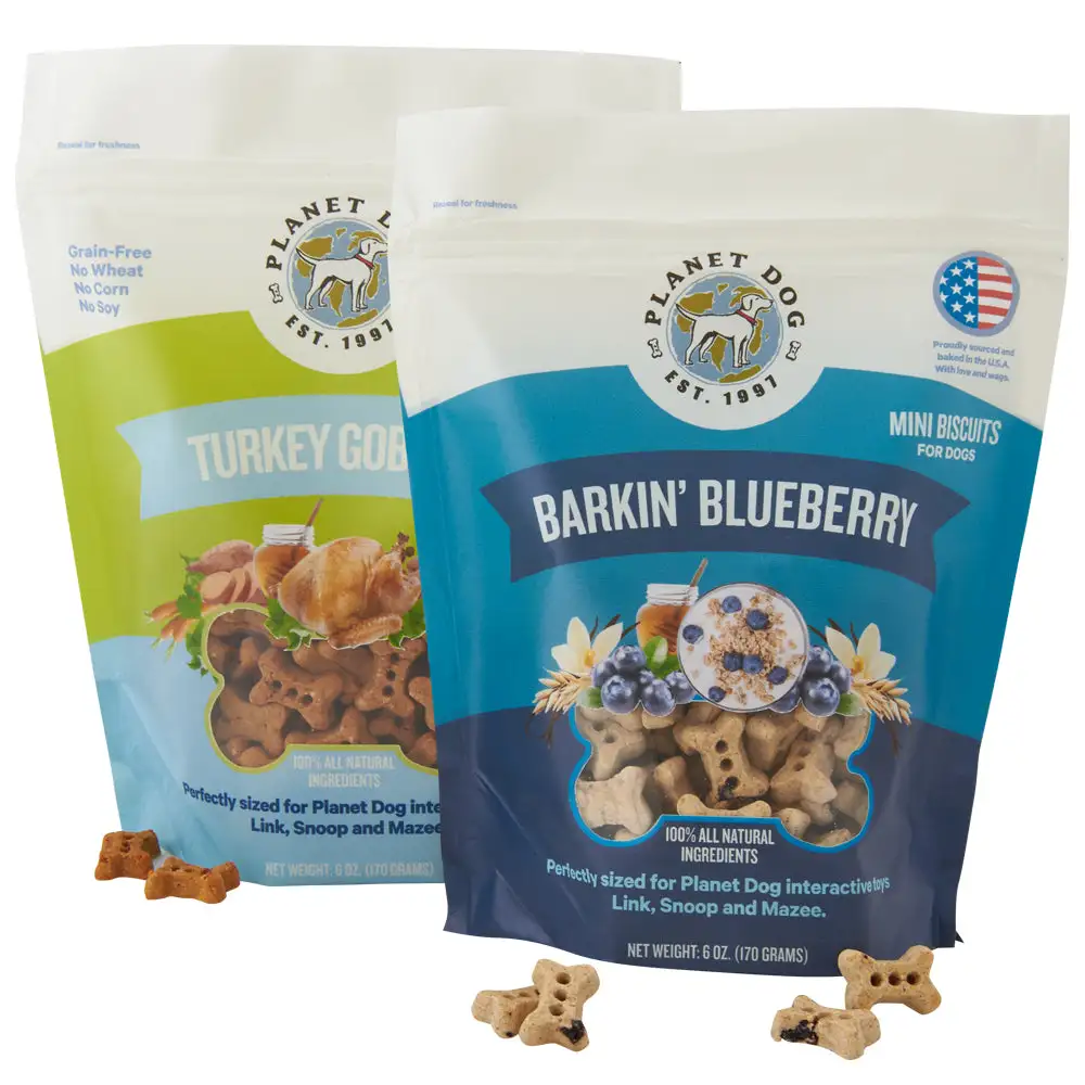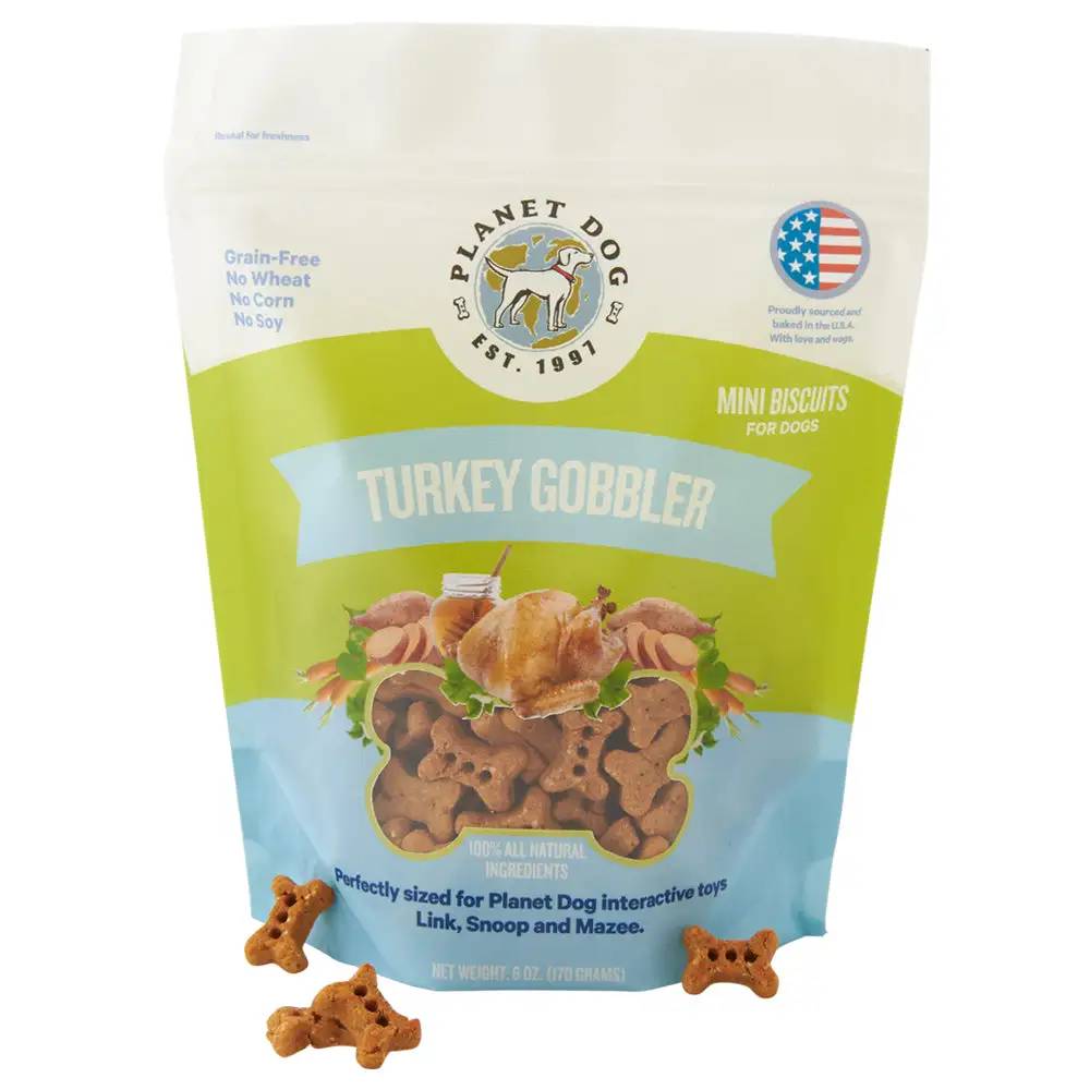 Available in 6 oz. bag size, in two flavors: Turkey Gobbler and Barkin’ Blueberry.