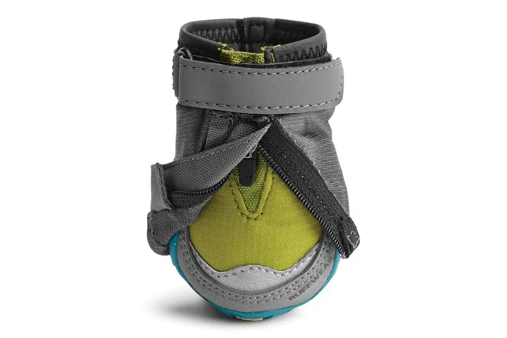 Closure system combines hook-and-loop with hardware, cinching around the narrowest part of the dog’s leg to provide a secure fit. Pullover stretch gaiter keeps snow out and improves retention by protecting the hook-and-loop ankle closure from the elements.