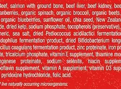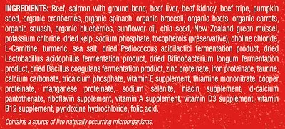 Beef, beef kidney, beef liver, goat, lamb, beef bone, pumpkin seed, organic cranberries, organic spinach, organic broccoli, organic beets, organic carrots, organic squash, organic blueberries, fenugreek seed, potassium chloride, dried kelp, sodium phosphate monobasic, tocopherols (preservative), choline chloride, dried Pediococcus acidilactici fermentation product, dried Lactobacillus acidophilus fermentation product, dried Bifidobacterium longum fermentation product, dried Bacillus coagulans fermentation product, zinc proteinate, iron proteinate, taurine, calcium carbonate, vitamin E supplement, thiamine mononitrate, copper proteinate, sea salt, manganese proteinate, sodium selenite, niacin supplement, d-calcium pantothenate, riboflavin supplement, vitamin A supplement, vitamin D3 supplement, vitamin B12 supplement, salmon oil, pyridoxine hydrochloride, folic acid.