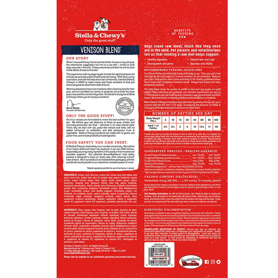 Venison, lamb, lamb liver, venison liver, venison lung, lamb kidney, lamb spleen, lamb heart, venison bone, olive oil, pumpkin seed, organic cranberries, organic spinach, organic broccoli, organic beets, organic carrots, organic squash, organic blueberries, fenugreek seed, potassium chloride, dried kelp, sodium phosphate, tocopherols (preservative), choline chloride, dried Pediococcus acidilactici fermentation product, dried Lactobacillus acidophilus fermentation product, dried Bifidobacterium longum fermentation product, dried Bacillus coagulans fermentation product, zinc proteinate, iron proteinate, taurine, calcium carbonate, vitamin E supplement, thiamine mononitrate, copper proteinate, manganese proteinate, sodium selenite, niacin supplement, d-calcium pantothenate, riboflavin supplement, vitamin A supplement, vitamin D3 supplement, vitamin B12 supplement, pyridoxine hydrochloride, folic acid.